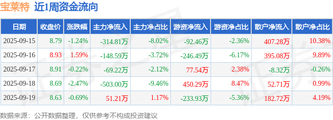 资金流向数据方面,本周宝莱特主力资金合计净流出984.41万元,游资资金合计净流出45.06万元,散户资金合计净流入1029.47万元。本周资金流向一览见下表: