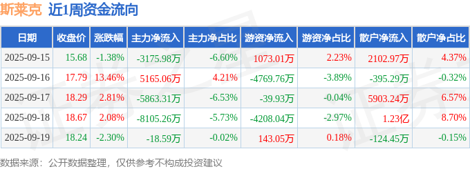 资金流向数据方面,本周斯莱克主力资金合计净流出1.2亿元,游资资金合计净流出7801.68万元,散户资金合计净流入1.98亿元。本周资金流向一览见下表: