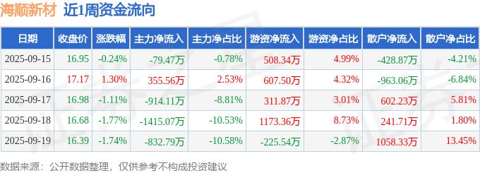 资金流向数据方面,本周海顺新材主力资金合计净流出2885.88万元,游资资金合计净流入2375.53万元,散户资金合计净流入510.35万元。本周资金流向一览见下表: