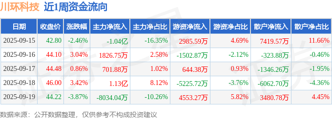 资金流向数据方面,本周川环科技主力资金合计净流出4622.16万元,游资资金合计净流入1454.65万元,散户资金合计净流入3167.5万元。本周资金流向一览见下表: