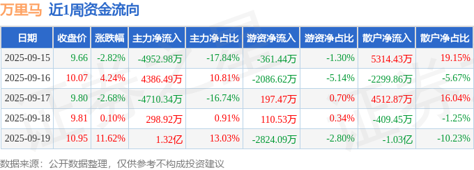 资金流向数据方面,本周万里马主力资金合计净流入8173.79万元,游资资金合计净流出4964.16万元,散户资金合计净流出3209.63万元。本周资金流向一览见下表: