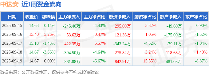 资金流向数据方面,本周中达安主力资金合计净流出525.79万元,游资资金合计净流入1191.84万元,散户资金合计净流出666.05万元。本周资金流向一览见下表:
