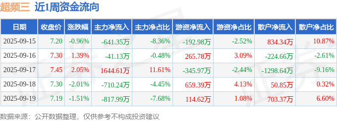 资金流向数据方面,本周超频三主力资金合计净流出566.1万元,游资资金合计净流入500.84万元,散户资金合计净流入65.26万元。本周资金流向一览见下表: