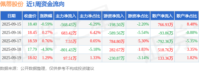 资金流向数据方面,本周佩蒂股份主力资金合计净流出581.37万元,游资资金合计净流入48.53万元,散户资金合计净流入532.83万元。本周资金流向一览见下表: