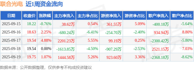 资金流向数据方面,本周联合光电主力资金合计净流入1390.35万元,游资资金合计净流入222.35万元,散户资金合计净流出1612.7万元。本周资金流向一览见下表: