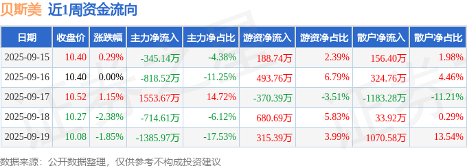 资金流向数据方面,本周贝斯美主力资金合计净流出1710.58万元,游资资金合计净流入1308.19万元,散户资金合计净流入402.38万元。本周资金流向一览见下表: