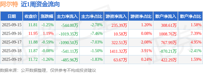 资金流向数据方面,本周阿尔特主力资金合计净流出3680.92万元,游资资金合计净流入2043.47万元,散户资金合计净流入1637.44万元。本周资金流向一览见下表: