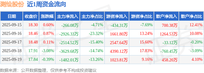 资金流向数据方面,本周测绘股份主力资金合计净流出1.08亿元,游资资金合计净流入9189.07万元,散户资金合计净流入1629.55万元。本周资金流向一览见下表: