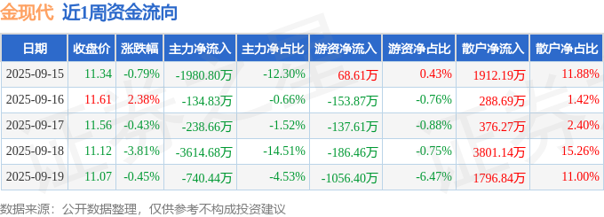 资金流向数据方面,本周金现代主力资金合计净流出6709.41万元,游资资金合计净流出1465.73万元,散户资金合计净流入8175.14万元。本周资金流向一览见下表: