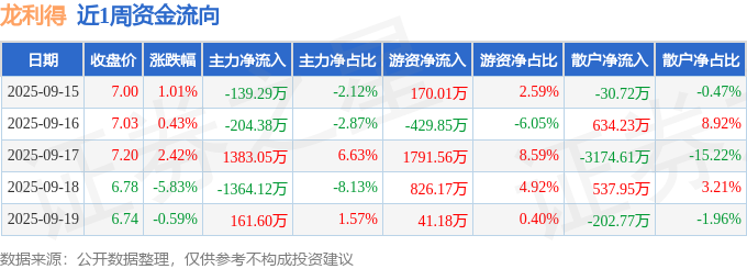 资金流向数据方面,本周龙利得主力资金合计净流出163.15万元,游资资金合计净流入2399.07万元,散户资金合计净流出2235.93万元。本周资金流向一览见下表: