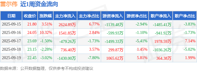 资金流向数据方面,本周雷尔伟主力资金合计净流入2993.88万元,游资资金合计净流出1873.25万元,散户资金合计净流出1120.63万元。本周资金流向一览见下表: