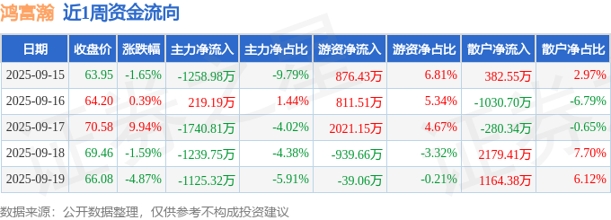 资金流向数据方面,本周鸿富瀚主力资金合计净流出5145.66万元,游资资金合计净流入2730.37万元,散户资金合计净流入2415.29万元。本周资金流向一览见下表: