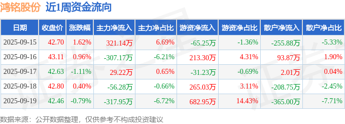 资金流向数据方面,本周鸿铭股份主力资金合计净流出331.04万元,游资资金合计净流入1064.8万元,散户资金合计净流出733.76万元。本周资金流向一览见下表: