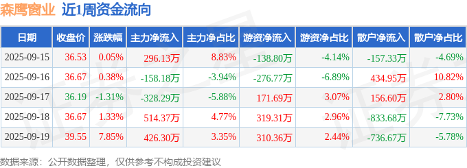 资金流向数据方面,本周森鹰窗业主力资金合计净流入750.34万元,游资资金合计净流入385.79万元,散户资金合计净流出1136.13万元。本周资金流向一览见下表: