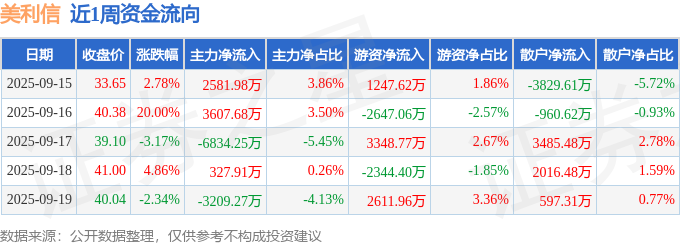 资金流向数据方面,本周美利信主力资金合计净流出3525.94万元,游资资金合计净流入2216.9万元,散户资金合计净流入1309.04万元。本周资金流向一览见下表: