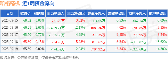 资金流向数据方面,本周凯格精机主力资金合计净流出2782.84万元,游资资金合计净流入5903.66万元,散户资金合计净流出3120.82万元。本周资金流向一览见下表: