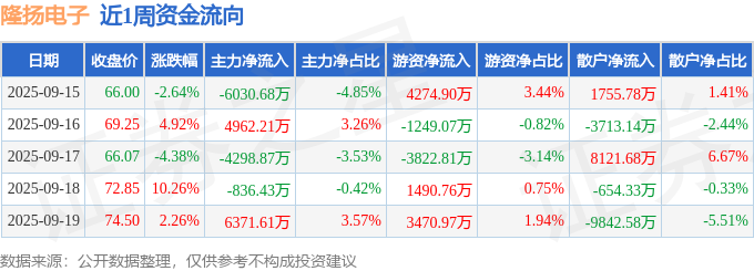 资金流向数据方面,本周隆扬电子主力资金合计净流入167.84万元,游资资金合计净流入4164.75万元,散户资金合计净流出4332.59万元。本周资金流向一览见下表:
