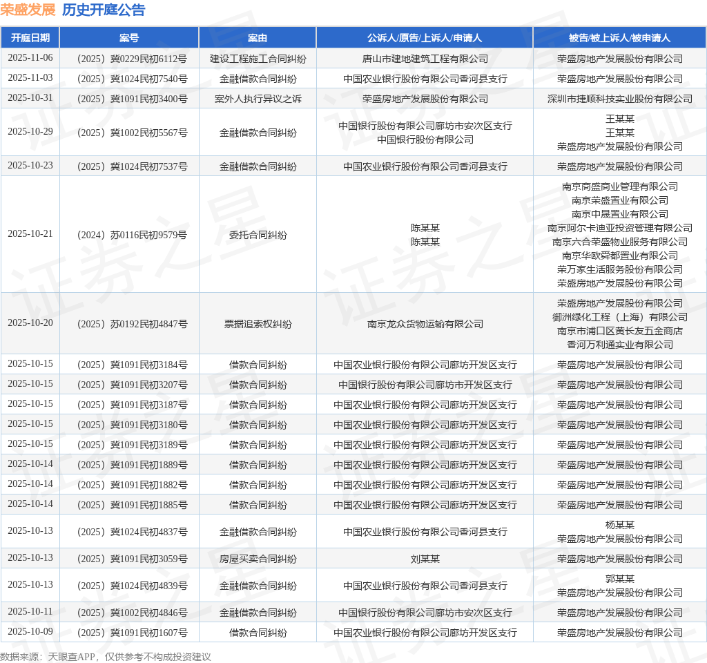 案号:(2025)苏0105民初3971号根据统计,近一年内以荣盛房地产发展股份有限公司为当事人的历史开庭公告有472则,其中案由为“票据追索权纠纷”的公告以88则居首,其次为“借款合同纠纷”有73则,“房屋买卖合同纠纷”有69则。历史开庭公告(前20条)如下: