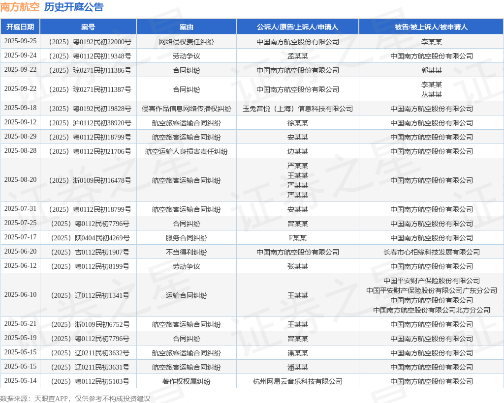 案号:(2025)粤0112民初19348号根据统计,近一年内以中国南方航空股份有限公司为当事人的历史开庭公告有56则,其中案由为“航空旅客运输合同纠纷”的公告以17则居首,其次为“著作权权属纠纷”有9则,“合同纠纷”有8则。历史开庭公告(前20条)如下:
