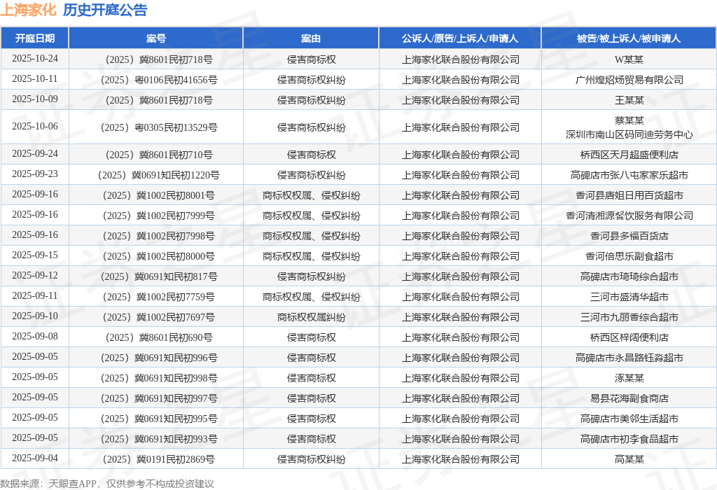 案号:(2025)冀8601民初710号根据统计,近一年内以上海家化联合股份有限公司为当事人的历史开庭公告有582则,其中案由为“侵害商标权纠纷”的公告以435则居首,其次为“侵害商标权”有62则,“商标权权属、侵权纠纷”有49则。历史开庭公告(前20条)如下: