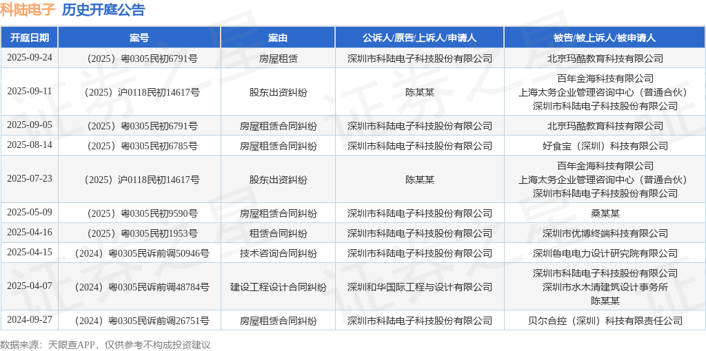 案号:(2025)粤0305民初6791号根据统计,近一年内以深圳市科陆电子科技股份有限公司为当事人的历史开庭公告有10则,其中案由为“房屋租赁合同纠纷”的公告以4则居首,其次为“股东出资纠纷”有2则,“建设工程设计合同纠纷”有1则。历史开庭公告如下: