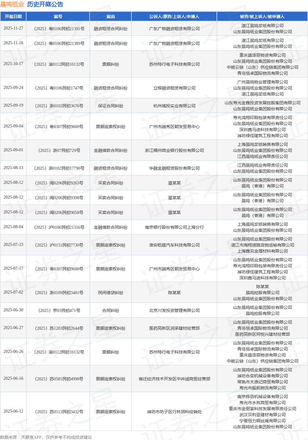 案号:(2025)粤0106民初1747号根据统计,近一年内以山东晨鸣纸业集团股份有限公司为当事人的历史开庭公告有81则,其中案由为“票据追索权纠纷”的公告以19则居首,其次为“融资租赁合同纠纷”有17则,“买卖合同纠纷”有11则。历史开庭公告(前20条)如下:
