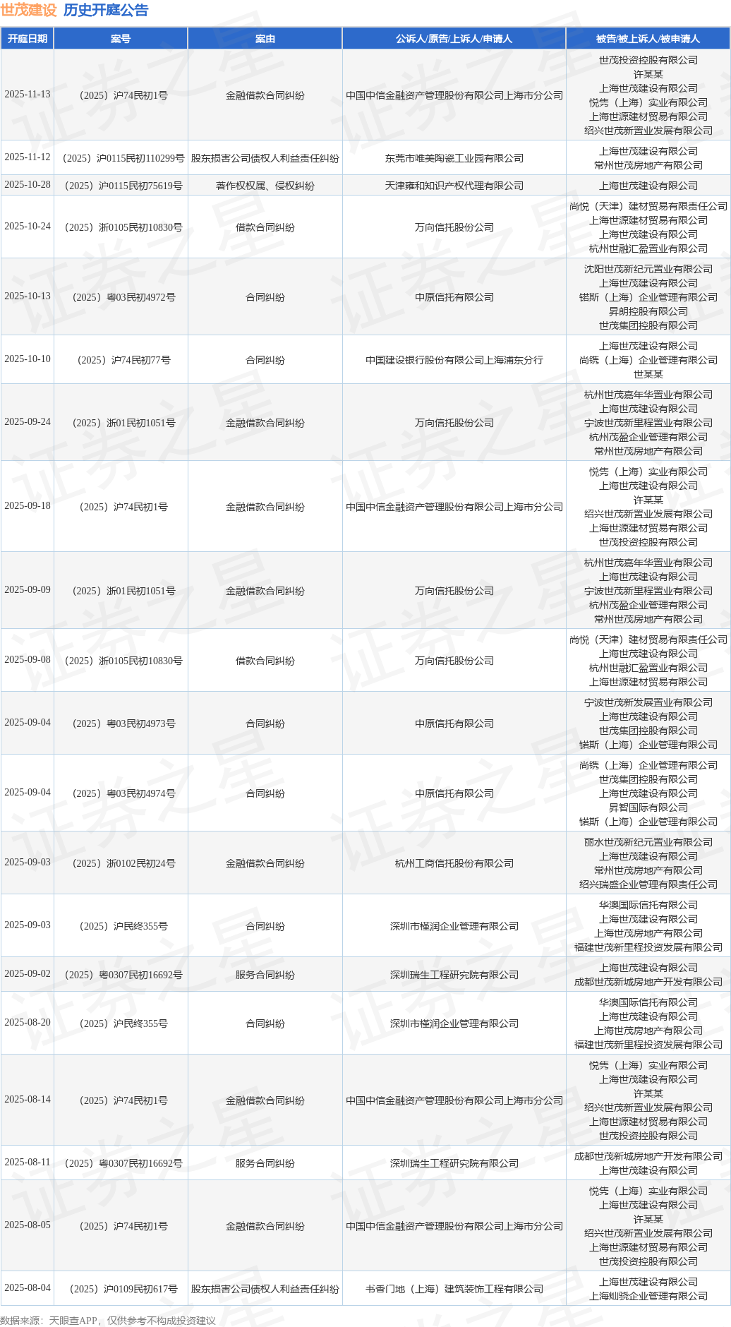 案号:(2025)浙01民初1051号根据统计,近一年内以上海世茂建设有限公司为当事人的历史开庭公告有81则,其中案由为“金融借款合同纠纷”的公告以29则居首,其次为“合同纠纷”有11则,“借款合同纠纷”有8则。历史开庭公告(前20条)如下: