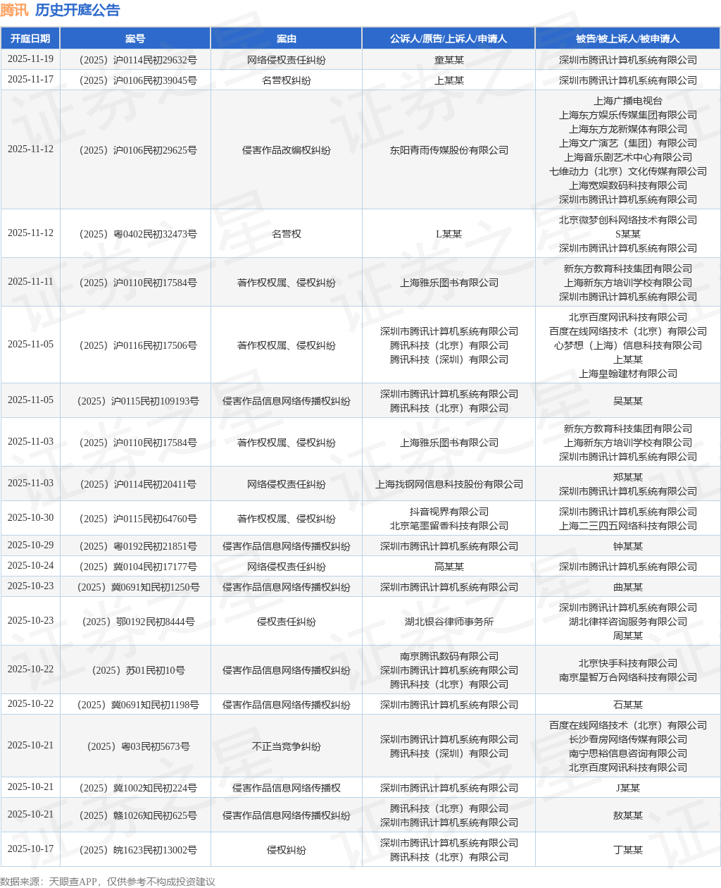 案号:(2025)沪0115民初84009号根据统计,近一年内以深圳市腾讯计算机系统有限公司为当事人的历史开庭公告有1361则,其中案由为“侵害作品信息网络传播权纠纷”的公告以441则居首,其次为“著作权权属、侵权纠纷”有127则,“网络侵权责任纠纷”有122则。历史开庭公告(前20条)如下: