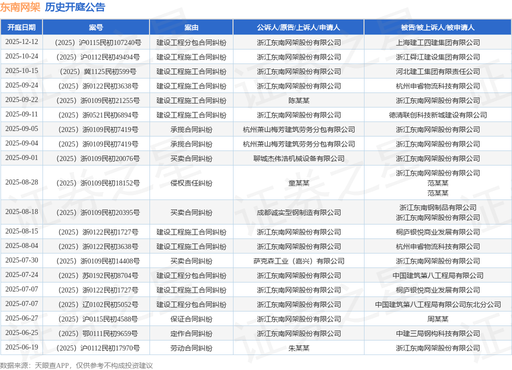 案号:(2025)浙0122民初3638号根据统计,近一年内以浙江东南网架股份有限公司为当事人的历史开庭公告有58则,其中案由为“建设工程施工合同纠纷”的公告以18则居首,其次为“建设工程分包合同纠纷”有9则,“承揽合同纠纷”有6则。历史开庭公告(前20条)如下: