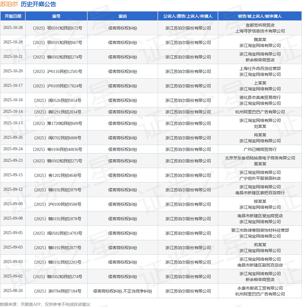 案号:(2025)粤0106民初40836号根据统计,近一年内以浙江苏泊尔股份有限公司为当事人的历史开庭公告有160则,其中案由为“侵害商标权纠纷”的公告以121则居首,其次为“商标权权属、侵权纠纷”有16则,“侵害商标权”有5则。历史开庭公告(前20条)如下: