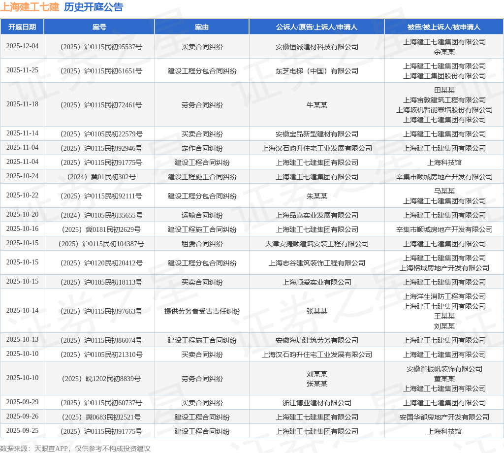 案号:(2025)浙01民初628号根据统计,近一年内以上海建工七建集团有限公司为当事人的历史开庭公告有237则,其中案由为“建设工程施工合同纠纷”的公告以52则居首,其次为“买卖合同纠纷”有43则,“建设工程分包合同纠纷”有33则。历史开庭公告(前20条)如下: