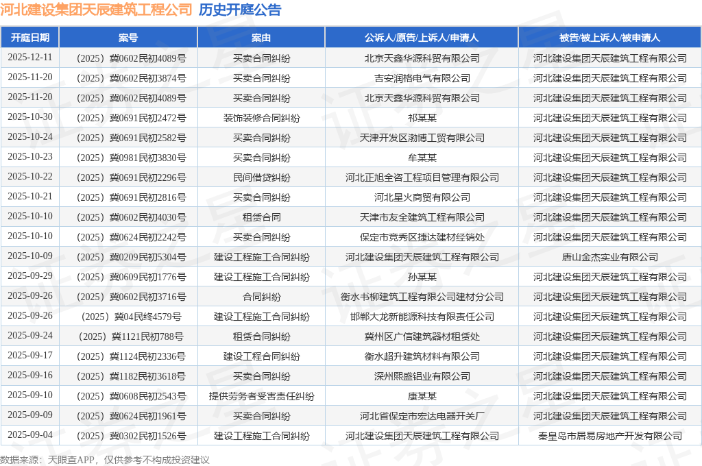 案号:(2025)冀1121民初788号根据统计,近一年内以河北建设集团天辰建筑工程有限公司为当事人的历史开庭公告有162则,其中案由为“买卖合同纠纷”的公告以61则居首,其次为“建设工程施工合同纠纷”有28则,“合同纠纷”有14则。历史开庭公告(前20条)如下: