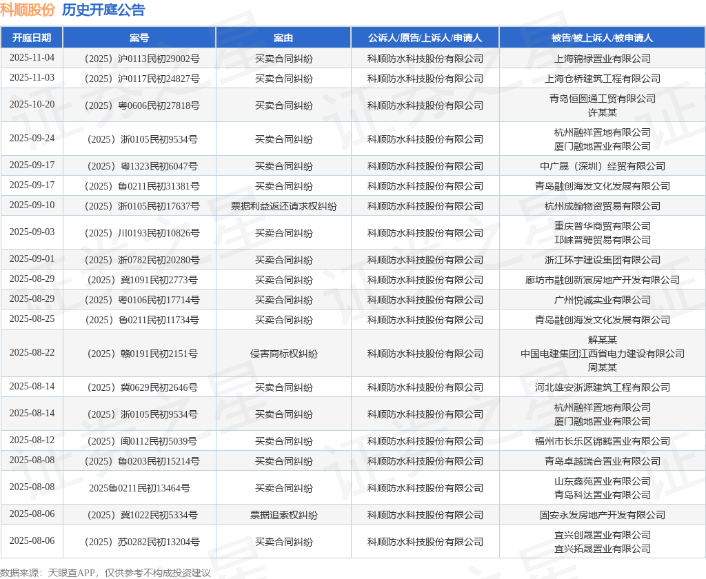 案号:(2025)浙0105民初9534号根据统计,近一年内以科顺防水科技股份有限公司为当事人的历史开庭公告有171则,其中案由为“买卖合同纠纷”的公告以106则居首,其次为“票据纠纷”有23则,“侵害商标权纠纷”有12则。历史开庭公告(前20条)如下: