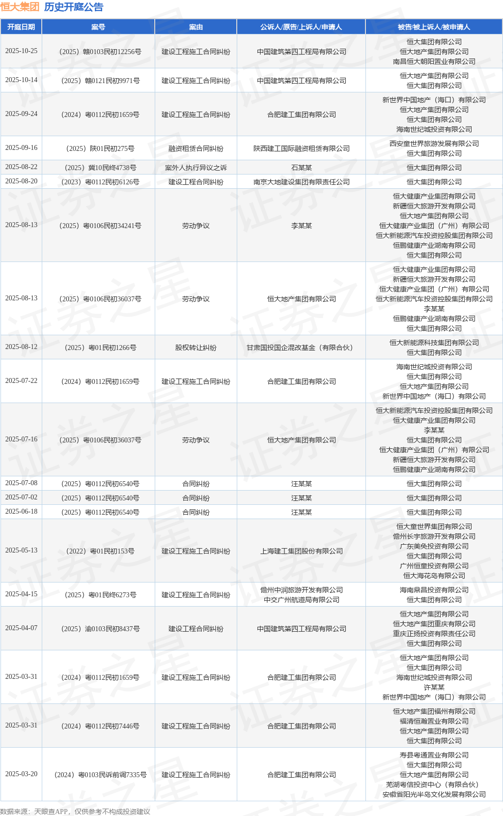 案号:(2024)粤0112民初1659号根据统计,近一年内以恒大集团有限公司为当事人的历史开庭公告有52则,其中案由为“建设工程施工合同纠纷”的公告以23则居首,其次为“合同纠纷”有8则,“劳动争议”有3则。历史开庭公告(前20条)如下: