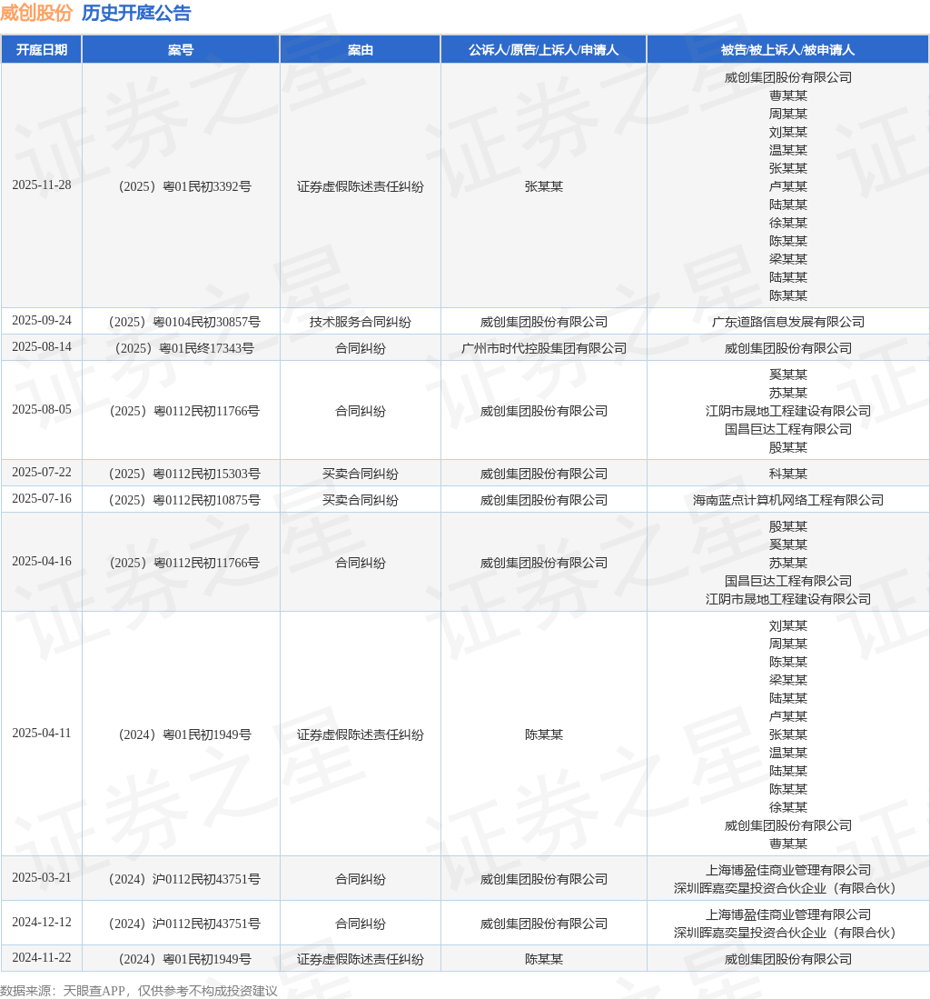 案号:(2025)粤0104民初30857号根据统计,近一年内以威创集团股份有限公司为当事人的历史开庭公告有11则,其中案由为“合同纠纷”的公告以5则居首,其次为“证券虚假陈述责任纠纷”有3则,“买卖合同纠纷”有2则。历史开庭公告如下: