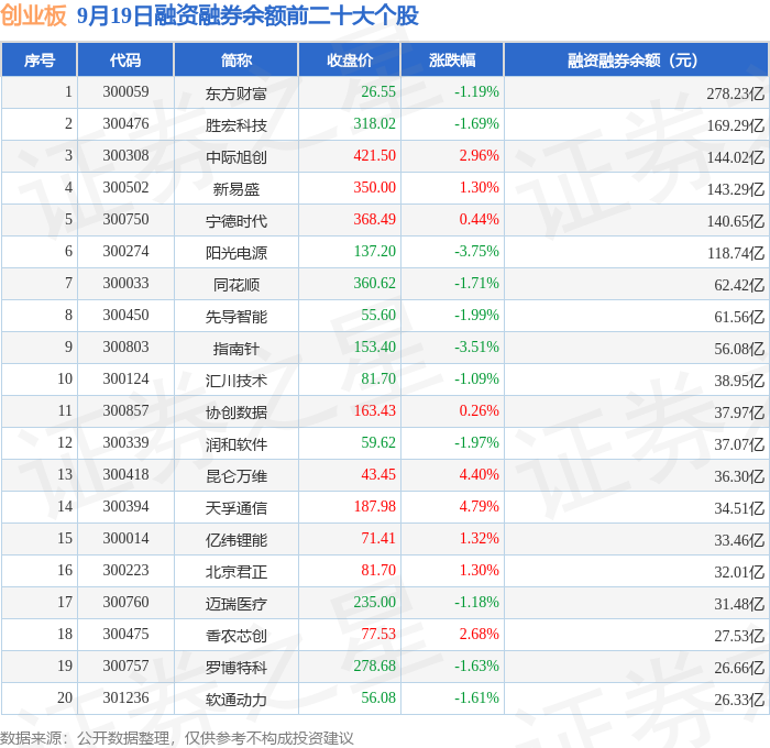 创业板融资融券余额前三分别为:东方财富(300059)融资融券余额278.23亿元、胜宏科技(300476)融资融券余额169.29亿元、中际旭创(300308)融资融券余额144.02亿元,前20具体见下表: