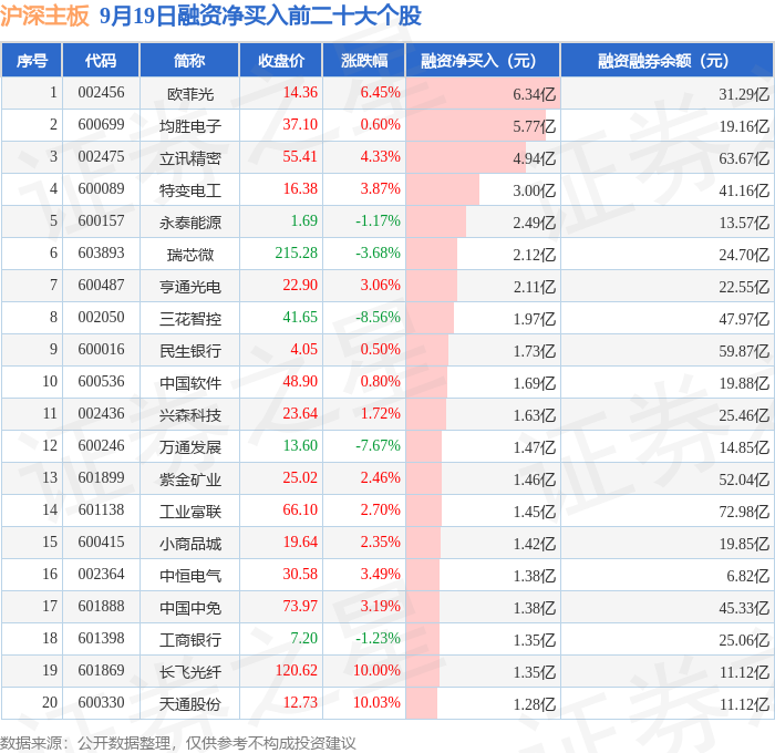 沪深主板融资净买入前三分别为:欧菲光(002456)融资净买入6.34亿元、均胜电子(600699)融资净买入5.77亿元、立讯精密(002475)融资净买入4.94亿元,前20具体见下表: