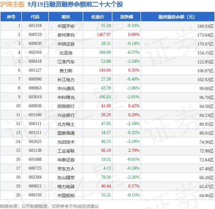 沪深主板融资融券余额前三分别为:中国平安(601318)融资融券余额249.93亿元、贵州茅台(600519)融资融券余额173.04亿元、中信证券(600030)融资融券余额170.67亿元,前20具体见下表: