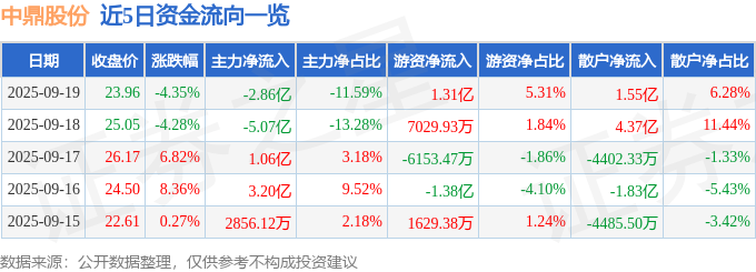 证券之星消息,截至2025年9月19日收盘,中鼎股份(000887)报收于23.96元,下跌4.35%,换手率7.69%,成交量101.04万手,成交额24.65亿元。