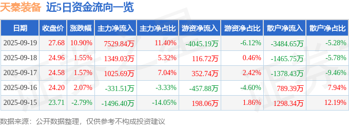 证券之星消息,截至2025年9月19日收盘,天秦装备(300922)报收于27.68元,上涨10.9%,换手率19.65%,成交量24.5万手,成交额6.61亿元。