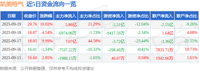 证券之星消息,截至2025年9月19日收盘,凯美特气(002549)报收于20.76元,上涨10.02%,涨停,换手率19.85%,成交量137.41万手,成交额27.52亿元。