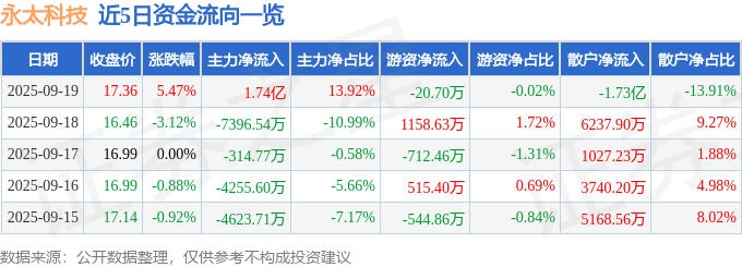 9月19日的资金流向数据方面,主力资金净流入1.74亿元,占总成交额13.92%,游资资金净流出20.7万元,占总成交额0.02%,散户资金净流出1.73亿元,占总成交额13.91%。