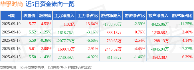 证券之星消息,截至2025年9月19日收盘,华孚时尚(002042)报收于5.77元,上涨4.53%,换手率7.62%,成交量129.67万手,成交额7.49亿元。