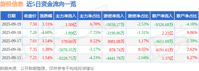 证券之星消息,截至2025年9月19日收盘,旋极信息(300324)报收于7.5元,上涨3.31%,换手率17.13%,成交量292.96万手,成交额22.32亿元。