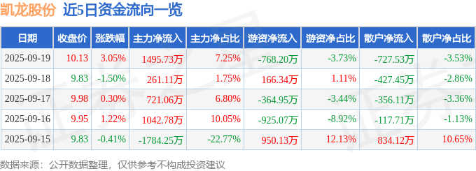 证券之星消息,截至2025年9月19日收盘,凯龙股份(002783)报收于10.13元,上涨3.05%,换手率4.64%,成交量20.44万手,成交额2.06亿元。