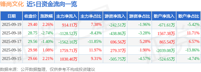 证券之星消息,截至2025年9月19日收盘,锋尚文化(300860)报收于29.4元,上涨2.26%,换手率3.81%,成交量4.26万手,成交额1.24亿元。