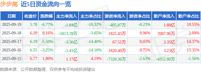 证券之星消息,截至2025年9月19日收盘,步步高(002251)报收于5.78元,下跌6.77%,换手率14.07%,成交量302.78万手,成交额17.79亿元。