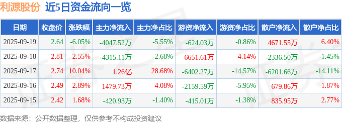 证券之星消息,截至2025年9月19日收盘,利源股份(002501)报收于2.64元,下跌6.05%,换手率7.67%,成交量271.91万手,成交额7.3亿元。