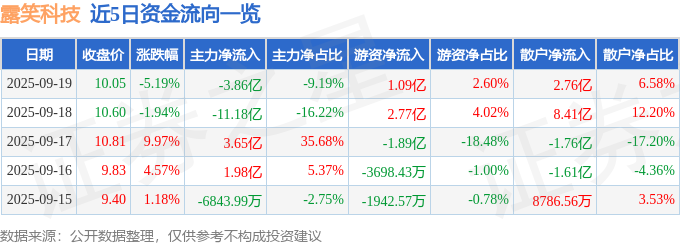 证券之星消息,截至2025年9月19日收盘,露笑科技(002617)报收于10.05元,下跌5.19%,换手率21.22%,成交量401.31万手,成交额41.97亿元。