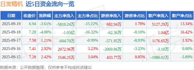 证券之星消息,截至2025年9月19日收盘,日发精机(002520)报收于6.94元,下跌3.61%,换手率7.65%,成交量54.87万手,成交额3.84亿元。